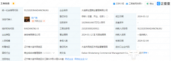 大连新达盟商业管理有限公司是大连万达商业管理集团的子公司,成立日期为今年1月12日,成立时间都不到三个月,注册资本约162.07亿元,法定代表人为肖广瑞,他也是万达商管集团的总裁。