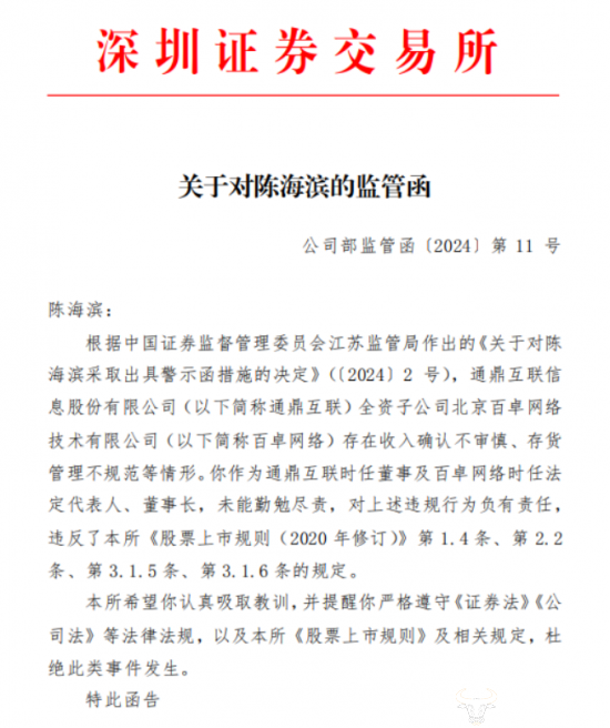 值得关注的是,2024年1月26日,深圳证券交易所发布了《关于对陈海滨的监管函》。监管函表示,通鼎互联的全资子公司百卓网络存在收入确认不审慎、存货管理不规范等情形,陈海滨作为通鼎互联时任董事及百卓网络时任法定代表人、董事长应吸取教训,严格守法杜绝此类事件。