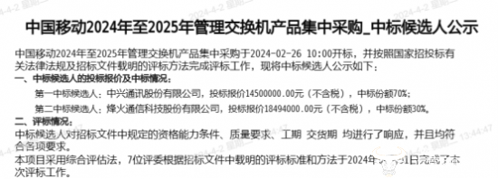近日,中国移动2024年至2025年管理交换机产品集中采购项目中标候选人公布,两大通信设备商成功中标,具体是什么情况?
