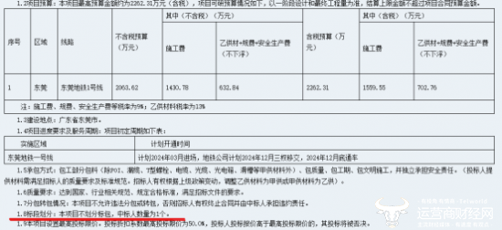 根据广东铁塔东莞2024年地铁一号线公网通信覆盖施工服务项目招标公告,本项目需要建设车站和隧道公网覆盖、传输及配套,以及运营商主设备安装。需求为东莞移动(广电共享)、东莞电信(联通共享)两家接入。据悉,东莞一号线计划2024年03月进场,地铁公司计划2024年12月三权移交,2024年12月底通车。