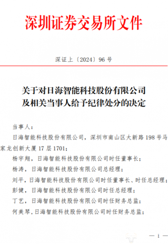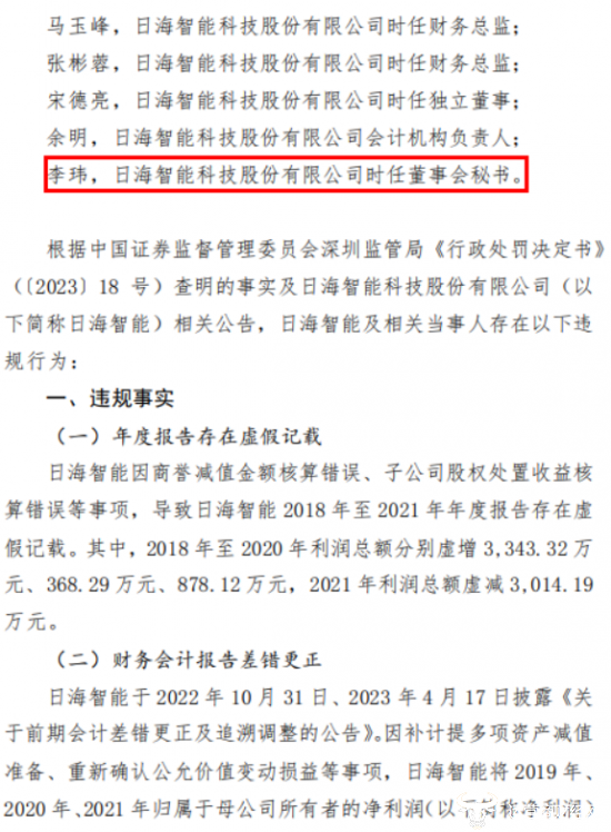 值得关注的是,2024年1月31日,深圳证券交易所发布文件《关于对日海智能科技股份有限公司及相关当事人给予纪律处分的决定》,该处分当事人包括日海智能董事长杨宇翔在内共十一人,其中就有前任董秘李玮。