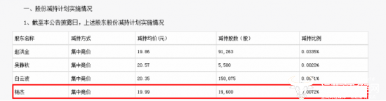 据悉,杨杰此次减持均价为19.99元/股,如果按此计算,杨杰此次共套现约39.2万元。