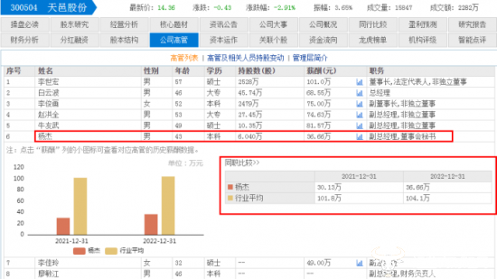 东方财富网显示,除了副总廖敏江的薪酬未公布,已公布的几位副总薪酬分别是赵洪全74.63万、牛友武81.57万以及李佳玲49万,其中杨杰的薪酬36.66万是最低的。