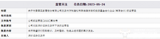 值得注意的是,去年5月,索菲亚交易对方张建松和珠海隆东股权投资基金合伙企业(有限合伙)收到了来自深交所的监管函。