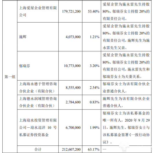 具体来说,截至2023年11月29日,爱屋企管由施永雷持股80%,其妻子郁瑞芬持股20%。而该公司的一致行动人为施辉、郁瑞芬、上海海永德于管理咨询合伙企业(有限合伙)、上海德永润域管理咨询合伙企业(有限合伙)、上海迎水投资管理有限公司-迎水巡洋 10 号私募证券投资基金。