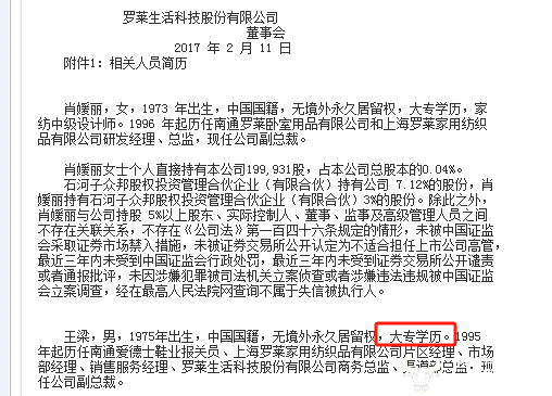 王梁出生于1975年,现年49岁。公开资料显示,他是长江商学院工商管理硕士。不过,根据2017年2月份发布的罗莱生活科技股份有限公司第四届董事会第一次会议决议公告显示,王梁那时对外披露的信息为大专学历,但也没披露其大专学历的毕业院校,以及是否全日制大专院校毕业。