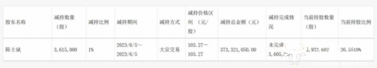 2023年6月,陈士斌由于个人资金需求减持公司股份361.5万股,套现3.73亿元。