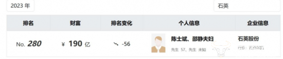 公司上市后,陈士斌的身价也随之上涨,在2023胡润百富榜上,陈士斌夫妇的身价已经达到了190亿,排名208位。