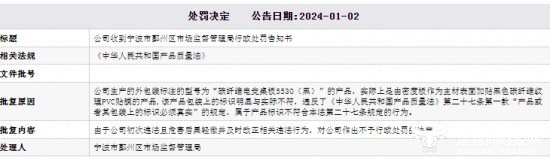 处罚原因是外包装标注为“碳纤维电竞桌板5530(黑)”的产品标识与实际不符,违反产品质量法第二十七条第一款:“产品或者其包装上的标识必须真实”。