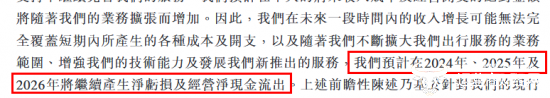 不仅目前处于亏损,如祺出行预计在未来三年也将持续亏损。招股书显示,公司在未来一段时间内的收入增长可能无法完全覆盖短期内所产生的各种成本及开支,同时称预计在2024年、2025年及2026年将持续产生净亏损及经营现金流出。