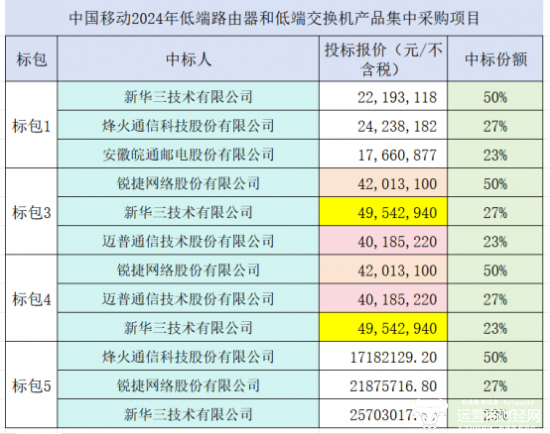 近日,中国移动公布了2024年低端路由器和低端交换机产品集中采购项目中部分标包的中选结果,哪些厂商成功中选?中标份额是如何分配的?