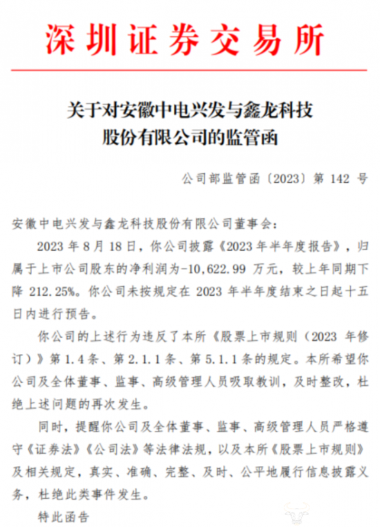 此外,在2023年8月,中电兴发由于未按规定在 2023 年半年度结束之日起十五日内进行2023半年度预告,收到了来自深圳证券交易所上市公司管理二部的监管函。