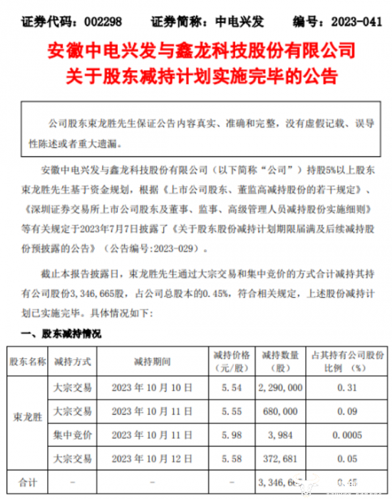 值得关注的是,2023年10月股东减持计划中,束龙胜通过大宗交易和集中竞价的方式合计减持其持有公司股份3,346,665股,占公司总股本的0.45%。按照每一次的交易均价计算,此次减持计划束龙胜共套现约1856.4万。