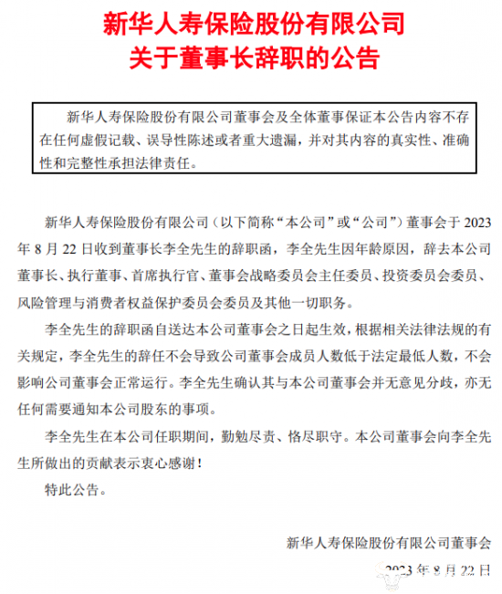 2023年8月22日,新华人寿保险发布关于董事长辞职的公告,文件显示,董事长李全因年龄原因,辞去该公司董事长、执行董事、首席执行官、董事会战略委员会主任委员、投资委员会委员、风险管理与消费者权益保护委员会委员及其他一切职务。