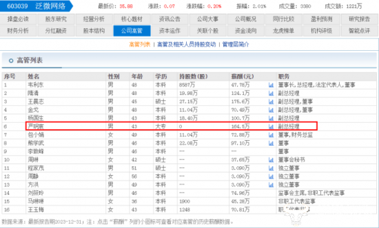东方财富网显示,严玥宸2023年薪酬为164.5万,而他在2023年担任副总的时间还不足半年。并且在泛微网络五位副总中,只有王晨志一人的薪酬175.6万高于严玥宸,其余几位薪酬皆在严玥宸之下,可见严玥宸自身一定有很强的工作能力。