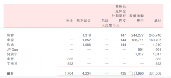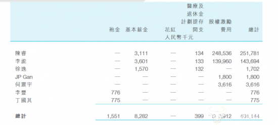 要搞清楚陈睿的基本工资,首先要明白哔哩哔哩的薪酬构成。年报显示,哔哩哔哩的薪酬主要由五部分构成,袍金、基本薪金、花红、医疗及退休金计划提存开支和股权激励费用。显而易见,股权激励费用占最大头。