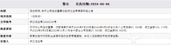 值得一提的是,今年4月3日,阳光照明时任独立董事薛跃收到了来自中国证券监督管理委员会浙江监管局的警示函,并记入证券期货市场诚信档案。
