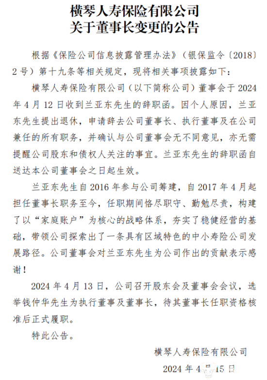 4月15日,横琴人寿发布公告称,原董事长兰亚东因个人原因退休辞任,公司选举钱仲华为新任董事长。而此时距离横琴人寿1月份更换凌立波为总经理才不到三个月。