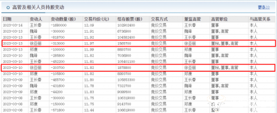 此外,在2023年3月10日和13日,徐亚丽通过竞价交易的方式进行了两次减持股份,分别是203700股和313000股。这两次的交易均价分别为11.82元和11.97元,根据计算可知这两次减持股份徐亚丽共套现约615.4万。