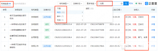 企查查数据显示,截至今年4月9日,刘磊是恒林股份44项专利的发明人之一,其中有效的32个。专利类型包含了外观设计、实用新型等,且大部分都是刘磊和公司总经理王江林等人共同发明,也有与副总经理王郑兴等人共同发明的。