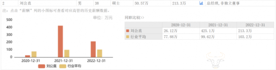 值得一提的是,据东方财富网显示,刘公直2022年的薪酬是213.3万,而在2021年他的年薪是425.1万,大幅降薪211万,不知是什么原因。
