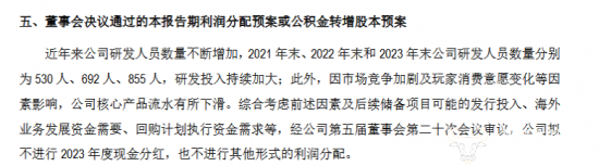 至于为何不进行年末分红了呢?吉比特表示,近年来公司研发人员数量不断增加,研发投入持续加大,此外,因市场竞争加剧及玩家消费意愿变化等因素影响,公司核心产品流水有所下滑。综合考虑前述因素及后续储备项目可能得发行投入、海外业务发展资金需要、回购计划执行资金需求等,因此拟不进行2023年度现金分红等。
