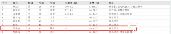 据东方财富网显示,吴艳梅的薪酬在公司高管中还不错,副总陈牧与副总蒋新荣以65.11万、63.09万的高薪位列第一、第二。其次便是吴艳梅,她的薪酬是59.43万。