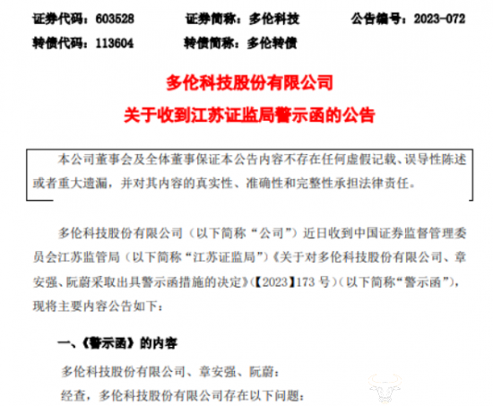 值得关注的是,2023年12月22日,多伦科技发布关于收到江苏证监局警示函的公告,当事人是公司董事长章安强和董秘阮蔚。此次收到警示函是由于公司在上证 e 互动平台上答复投资者时信息披露不准确、在 2023 年第三季度业绩说明会上回复投资者时信息披露制度不健全,而章安强和阮蔚对此负有主要责任。