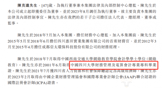 公开资料显示,陈克远47岁,早在2001年的时候,他取得了四川大学财务管理及电算会计专业专科毕业证。不过当年他24岁,而且四川大学作为全国知名大学,不招专科生。所以,陈克远的“四川大学专科毕业证”到底是怎么回事?作为上市公司,其高管学历描述需要严谨,需要讲究诚实。