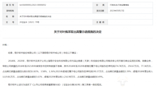 值得关注的是,2023年5月17日,叶枫收到了来自上海证监局的警示函。此次警示是由于2018年、2020年,格尔软件及其子公司等多家公司开展无商业实质的采购、销售业务,导致公司披露的2018年至2021年年度报告中的财务数据不准。