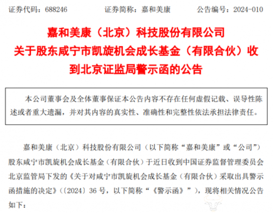 值得关注的是,2024年2月9日,嘉和美康发布关于股东咸宁市凯旋机会成长基金(有限合伙)收到北京证监局警示函的公告。此次警示是由于咸宁市凯旋机会成长基金在2022 年 12 月 14 日至 2023 年 1月5日期间,在未预先披露减持计划的情况下合计减持公司股份1,878,775股,占公司总股本的 1.36%。