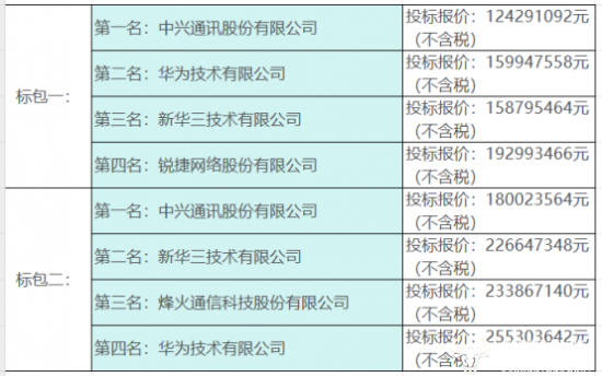 标包一的四位中标候选人分别为中兴通讯、华为、新华三、锐捷通讯;标包二的四位中标候选人分别为中兴通讯、新华三、烽火、华为。