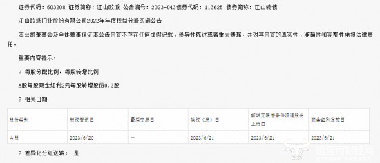 去年6月,江山欧派发布公告称,2022年年度权益分派实施A股每股现金红利2元,每股转增股份0.3股。股权登记日为2023年6月20日,除权(息)日为2023年6月21日。