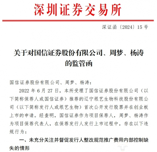 今年1月4日,国信证券因在保荐辽宁垠艺生物科技项目上市过程中,存在未充分关注并督促发行人整改规范推广费用内部控制缺失的情形、对发行人经销收入相关事项核查不到位导致其多计营业收入5528.64万元两宗违规行为,公司及保荐代表人周梦、杨涛均被深交所出具警示函。