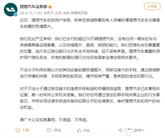 不过理想汽车法务部很快发布声明否认照片出自理想MEGA车内摄像头。官方表示,网传图片是:不法分子利用车辆以外的其他设备拍摄色情图片,用移花接木的手段,通过微信群进行传播和抹黑,手段极其肮脏恶劣,情节及其严重,是典型的违法犯罪行为。