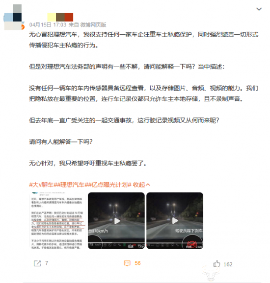 网友的质疑是:这行驶记录视频又从何而来呢?当时有网友称,“如果没有车主授权,行车记录仪内容应该是属于隐私信息,车厂不仅无权公布,甚至连采集都是需要脱敏的,这段视频,不仅没有脱敏,就是原版,必须有交代的”。