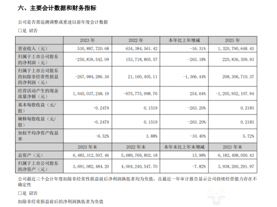 归属于上市公司股东的净利润也由盈转亏,亏损2.51亿元,较2022年的盈利1.54亿元,大幅下滑263.18%;