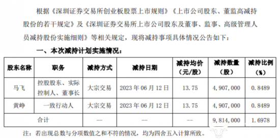 公告称,公司于6月12日收到控股股东、实际控制人马飞及一致行动人黄峥的《股份减持计划实施完毕的告知函》。二人已通过大宗交易的方式合计减持其持有公司股份981.4万股,减持比例占公司当前总股本约5.78亿股的1.6978%。根据交易均价13.75元计算可知,二人此次减持股份共套现约1.35亿。