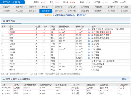 东方财富网显示,王晓娜2023年的薪酬为60.87万,是北信源披露出的高管薪酬中最高。并且在2023年12月,王晓娜还增持股份98.99万股,是2023年唯一一位增持股份的高管。