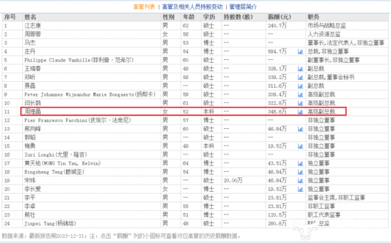 东方财富网显示,周理晶2023年薪酬为348.8万,在长飞光纤披露出的高管薪酬中位居第二,仅次于总裁庄丹的薪酬584.7万,并且周理晶还是高级副总裁中唯一一位女性。而与周理晶2020年刚上任高级副总裁时的薪酬187.5万相比,四年薪酬上涨161.3万,涨幅约为86%。