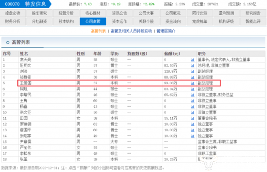 2021年8月,在公司董事会第八届三次会议上王爱国被聘任为副总经理,进入特发集团高管行列。2022年,王爱国的薪酬为99.08万,在特发信息披露出的高管薪酬中位居第二,仅次于另一位副总经理刘涛的126.8万。