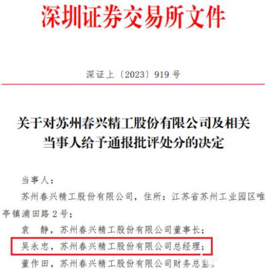 值得关注的是,2023年9月26日,春兴精工收到了来自深圳证券交易所的通报批评处分,其中当事人就包括吴永忠,除他之外还有董事长袁静和财务总监董作田。