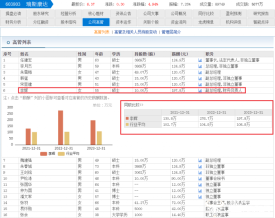 东方财富网显示,李辉2023年的薪酬为197.8万,在目前瑞斯康达披露出的高管薪酬中位居首位。然而,尽管李辉2023年的薪酬最高,但与她2022年的薪酬276.7万相比,还是大幅下降了78.9万。