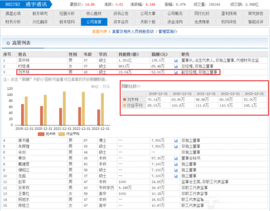东方财富网显示,刘木林2023年薪酬为52万,与2022年薪酬60.05万相比,下降了8.05万。然而,董事会秘书黄华于2023年8月加入通宇通讯,10月开始担任董事会秘书一职,薪酬却达到了57.3万,比刘木林还高。
