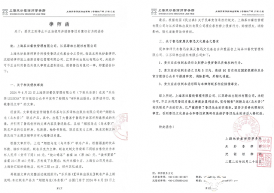 4月24日,上海朱妙春律师事务所受鲁迅文化基金会委托,向乐乐茶所属公司上海茶田餐饮管理有限公司、江苏译林出版社有限公司发布了律师函。