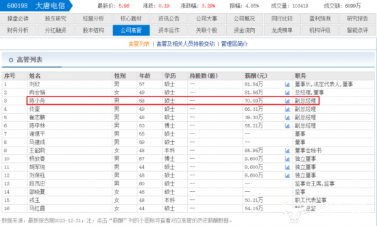 东方财富网显示,陈小舟2023年薪酬为70.09万,在大唐电信披露出的高管薪酬中位居第三,仅次于董事长刘欣的81.54万和总经理冉慧娟的81.56万。与和他同一时间上任副总一职的佟奎66.31万相比,陈小舟的薪酬也更高。