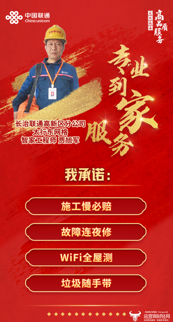贾旭军,山西长治联通高新区分公司一名普通的智家工程师,1999年入职联通公司,他25年如一日,始终坚守“在岗就要爱岗,爱岗就要敬业”的初心,秉承钻研技术,精益求精的工作态度和职业精神,在平凡的岗位上匠心铸梦,兢兢业业,多次荣获分公司“先进工作者”和“好员工”和光荣称号,同时他也被众多客户称为“热心人”和“贴心人”。