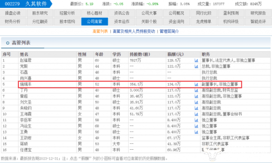 东方财富网显示,2022年施瑞丰的薪酬为123万,2023年薪酬为134万,上涨了11万,在久其软件披露出的高管薪酬中位居首位,而且他的持股数也不低,354.3万,仅次于董事长赵福军。