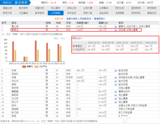 东方财富网显示,2023年黄素龙的薪酬为144.7万,在新点软件披露出的高管薪酬中位居第二,仅次于董事长曹立斌的152.2万。不过这已是黄素龙连续第二年降薪了,他的薪酬在2021年时最高,为174.1万,两年时间下降了21.9万。