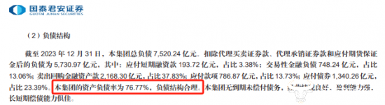国泰君安证券在最新2023年年报中披露,公司资产负债率达76.77%,这显然是高于很多证券公司,但其却依然称公司负债结构合理,这种说法对吗?